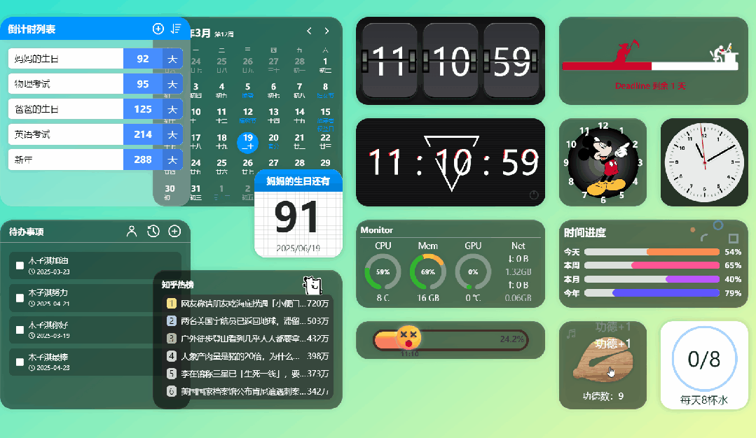 你可以一次性将多个小组件放到电脑桌面,并且可以自由调整每个小组件的位置,还可以设置小组件的内容。你可以实现的效果和功能包括:电脑桌面待办事项、电脑桌面动态时钟、电脑桌面倒数日、电脑桌面番茄钟、电脑桌面新闻资讯、电脑桌面动态照片轮播、电脑桌面实时 CPU 内存、电脑桌面实时网速、电脑桌面时间进度、在电脑桌面敲击电子木鱼、电脑桌面翻页时钟、电脑桌面生日列表、电脑桌面日历。