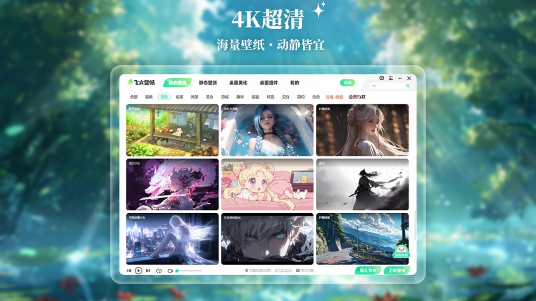 飞火动态壁纸是一款功能强大的电脑桌面美化软件,软件界面简洁,操作简单易用,海量的高质量精美动态壁纸和静态壁纸,拥有动漫、游戏、萌宠、每年、科技、4k、桌面主题等等类型,支持mp4、WebM、avi、m4vmov、wmv等多种格式文件导入,满足用户不同设备的壁纸美化需求,感兴趣的小伙伴赶快下载使用吧!