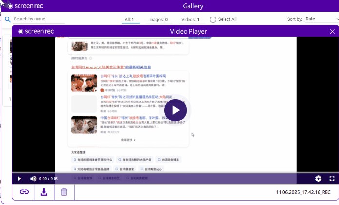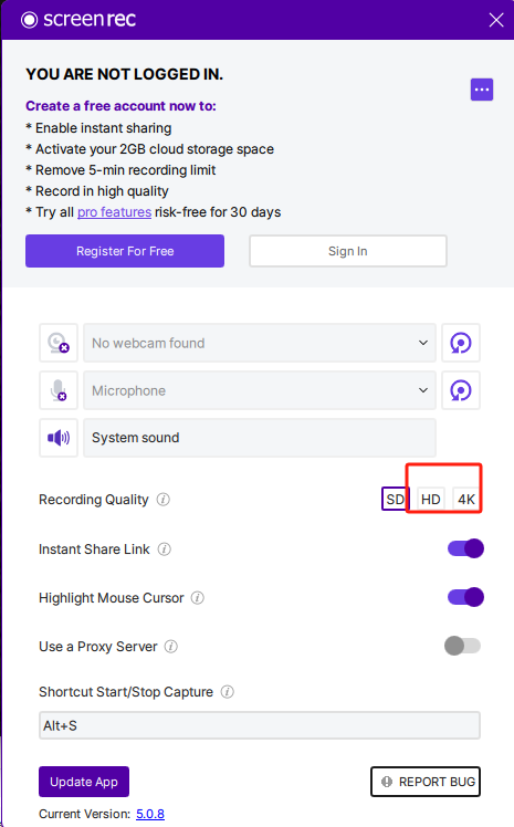 分享一款录屏软件,ScreenRecv5.0.8是一款支持高清、4K录屏的免费软件 主要功能: 1.简洁小巧 2.支持链接分享 3.支持HD、4k录屏 4.支持云端存储 0.超级轻量的视频录制软件 1.alt+S 框选录制区域 2.3秒倒计时开始录制 3.录制后可选择保存到本地,分享链接需要注册,有容量限制 |