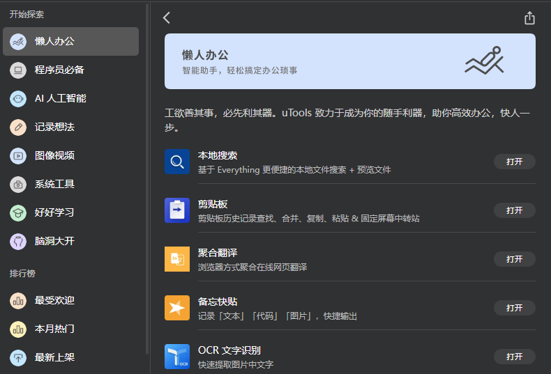 能够满足日常工作中各种各样需求,主要有懒人办公、程序员必备、AI 人工智能、记录想法、图像视频、系统工具、好好学习、脑洞大开等多个板块,还有相关排行榜。