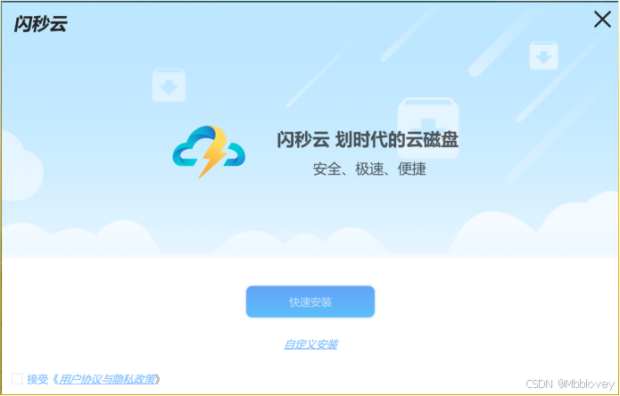 接收闪秒云《用户协议与隐私政策》后即可开始安装,您还可以点击自定义安装来更改闪秒云的安装目录。