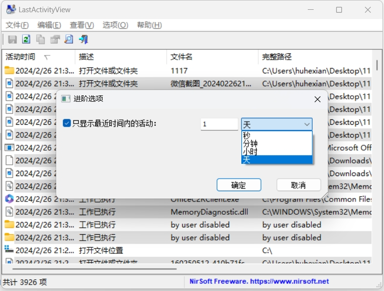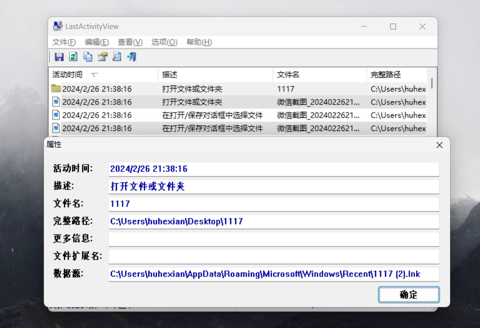 双击任意一条描述,可以查看更加详细丰富的内容,查看活动时间、描述、文件名、完整路径、数据源等等。