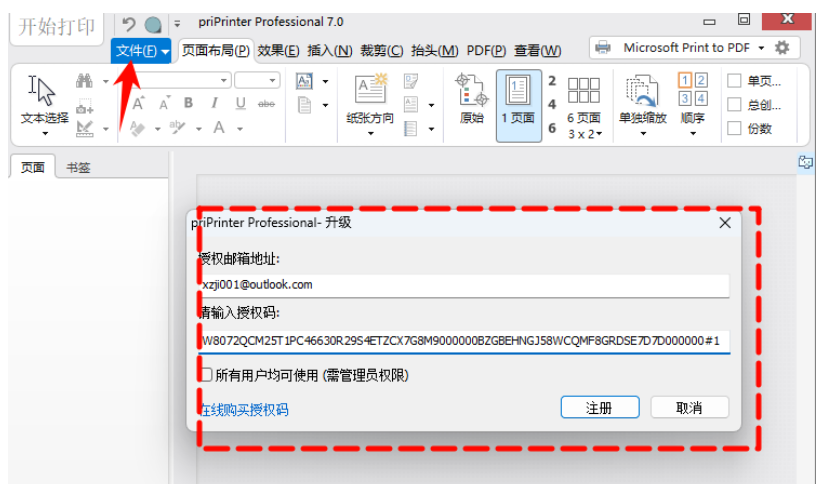 4. 运行priPrinter软件,点击“文件”菜单中的“关于”,将生成的email和产品密钥填写到软件中,即可成功激活。