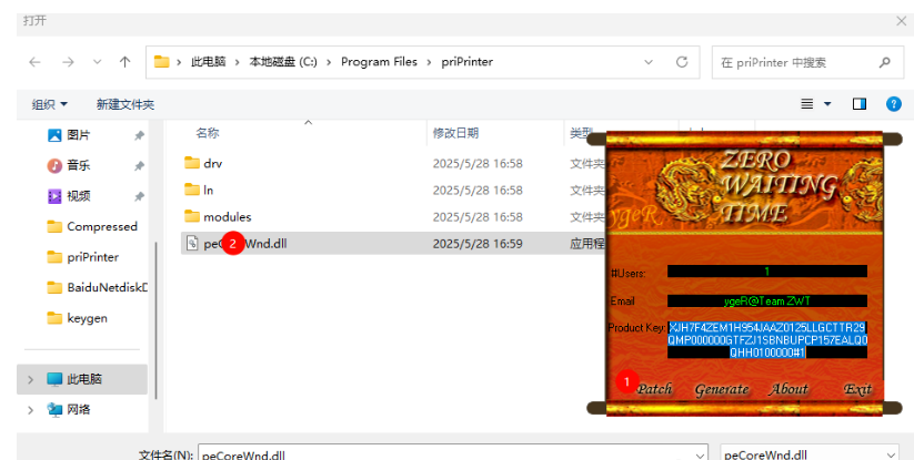 2. 以管理员身份运行keygen.exe,点击Patch,选择主程序安装目录下的peCoreWnd.dll文件,替换成功后会有提示。