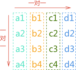 上图中,{a1, a2, a3, a4}、{b1, b2, b3, b4}、{c1, c2, c3, c4}、{d1, d2, d3, d4} 中各自包含的元素具有“一对一”的逻辑关系,同时 a、b、c、d 这 4 个序列也具有“一对一”的逻辑关系。