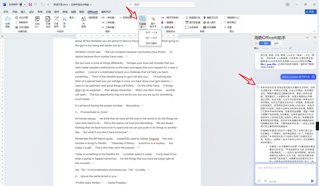 超强翻译功能:对于需要翻译文档的用户来说,市场上虽然有不少翻译软件,但这款Office插件无疑是一个更高效的选择。它能够直接对文档内容进行翻译,只需轻轻一点,就能完成操作。而且,OfficeAI支持多种语言的翻译,包括英语、西班牙语、法语、德语、意大利语、葡萄牙语、荷兰语、俄语、日语、韩语、中文、阿拉伯语、希腊语、土耳其语、印度尼西亚语、越南语等,几乎涵盖了我们日常可能用到的所有语言。