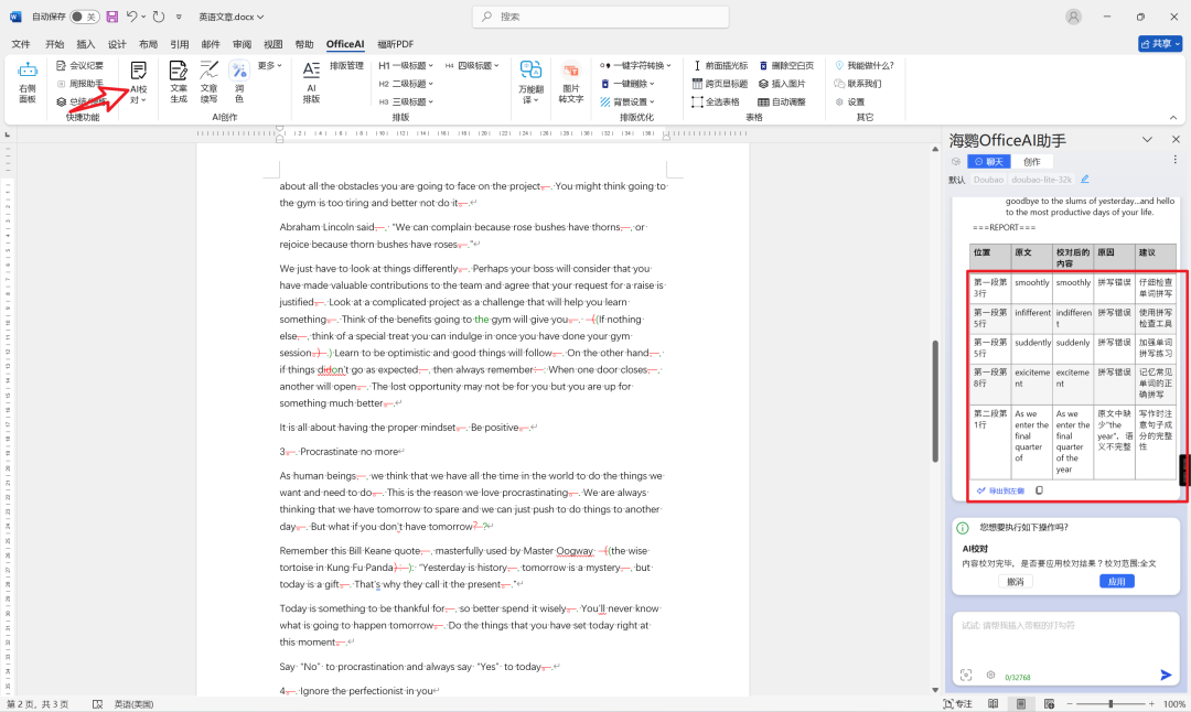 超强校对功能:在日常写作中,为了避免出现错误,我们常常需要反复校对。文章短还好,一旦篇幅较长,校对工作就会变得异常繁琐。而这款AI校对功能则能轻松解决这一问题。只需一键点击校对,插件就能自动帮你找出词语等错误,大大节省了时间和精力。