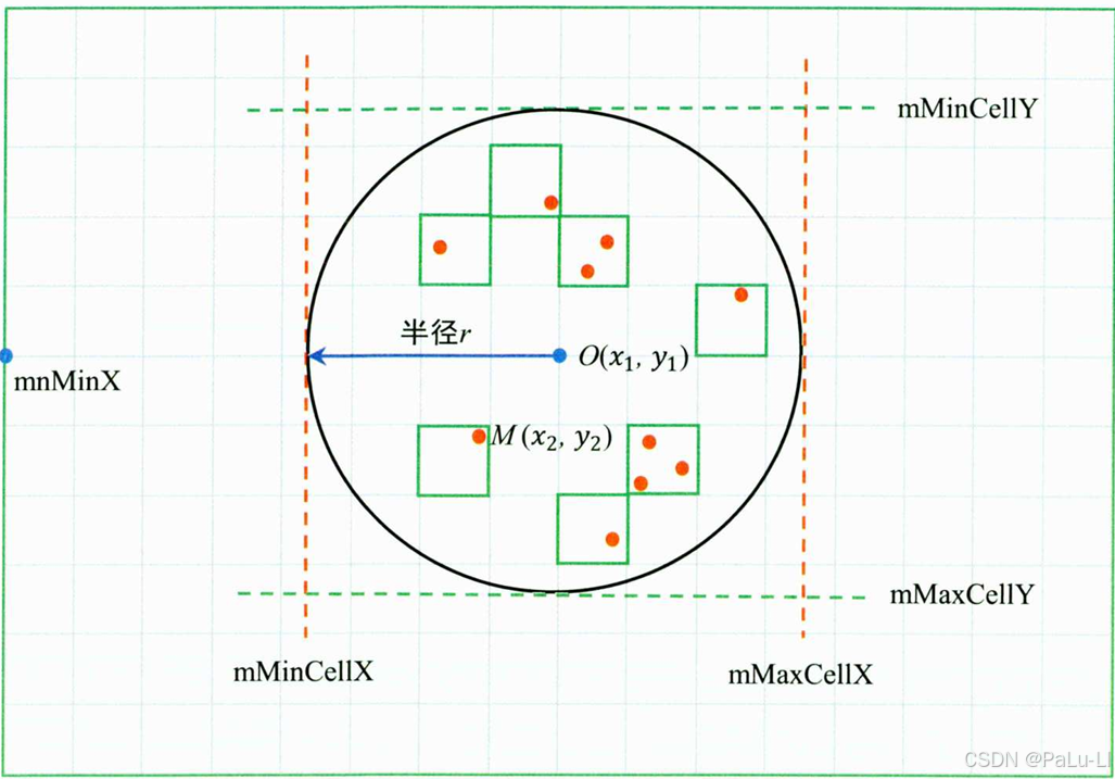 在特征点提取中,我们已经将提取的特征点划分到了不同的网格中了,我们在搜索时可以以网格为单位进行,这样可以通过遍历搜索圆域中的网格来代替圆域内的像素,大大的增加了匹配特征点的效率。