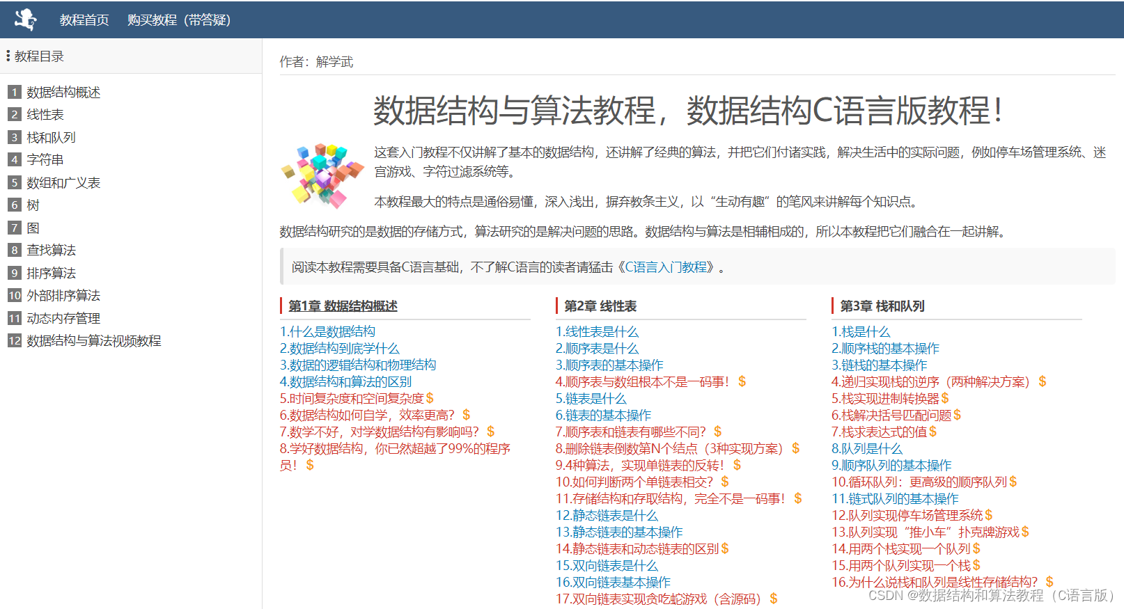 网站上有一整套的数据结构和算法教程,是 C 语言版本的,整套教程通俗易懂,不学院派,内容全面详尽,提供了完整、可运行的 C 语言程序,非常适合有 C 语言基础、对数据结构感兴趣的读者。