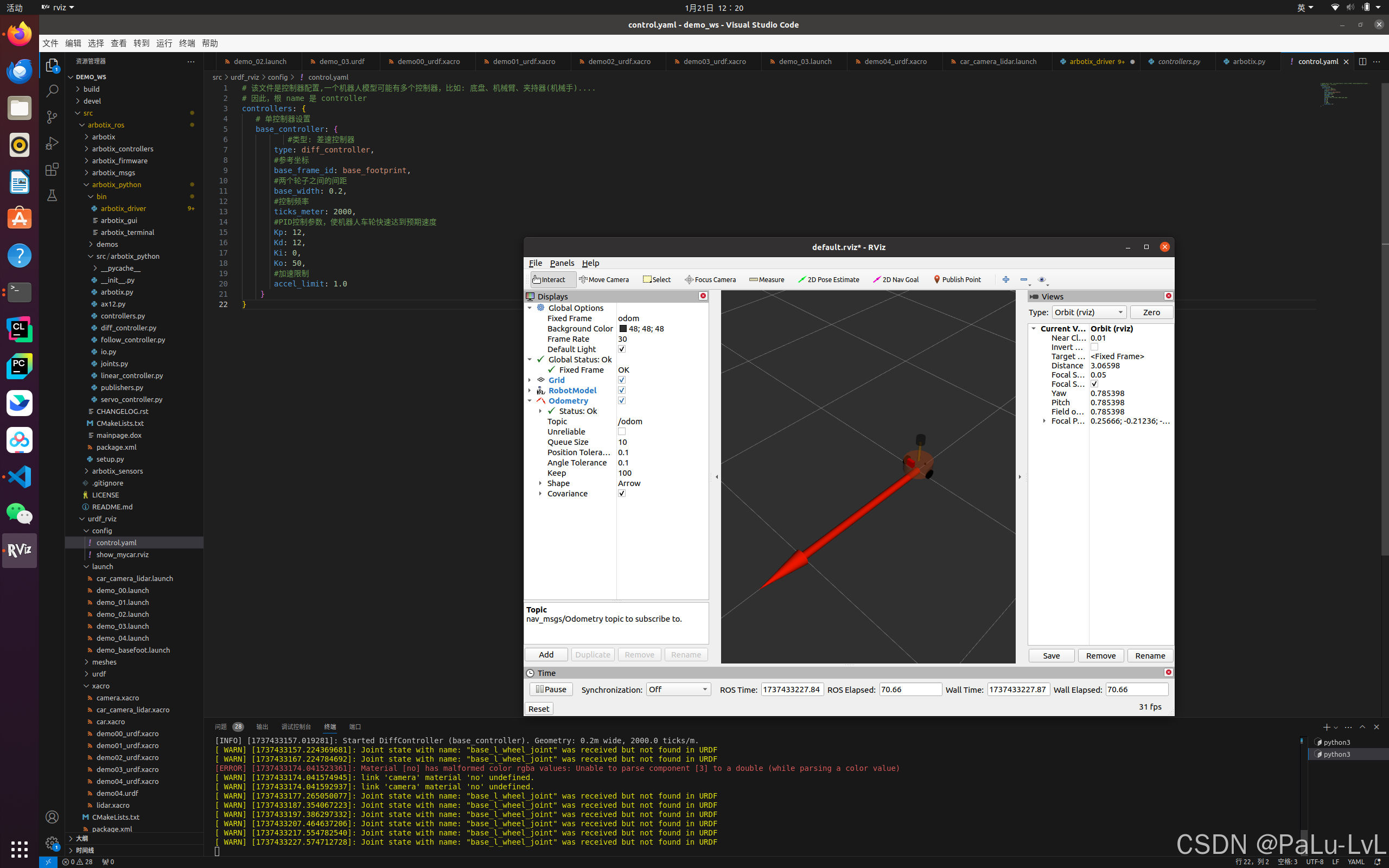 arbotix是一款控制电机、舵机的控制板,并提供相应的ros包,这个功能包的功能不仅可以驱动真实的arbotix控制板,它还提供一个差速控制器,通过接收速度控制指令更新机器人的joint状态,从而帮助我们实现机器人在rviz中的运动。