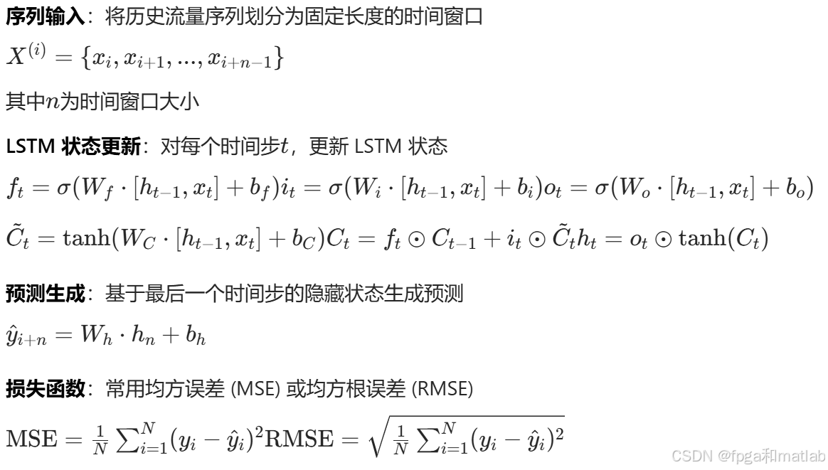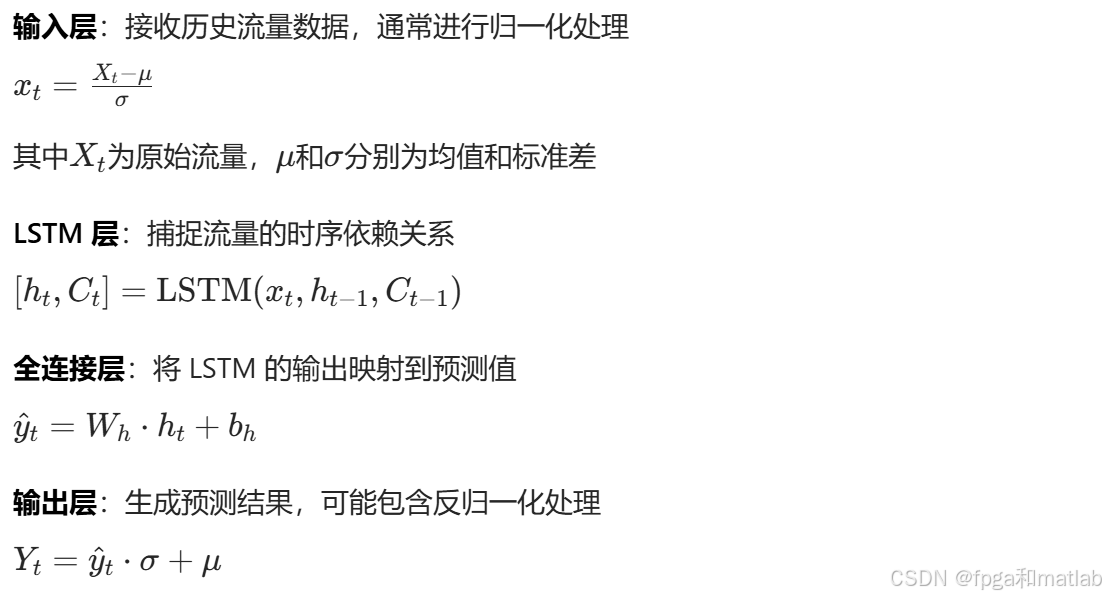 给定历史流量序列X={x1​,x2​,...,xT​},LSTM的目标是预测未来时刻的流量值y^​T+1​。LSTM的预测过程可表示为: